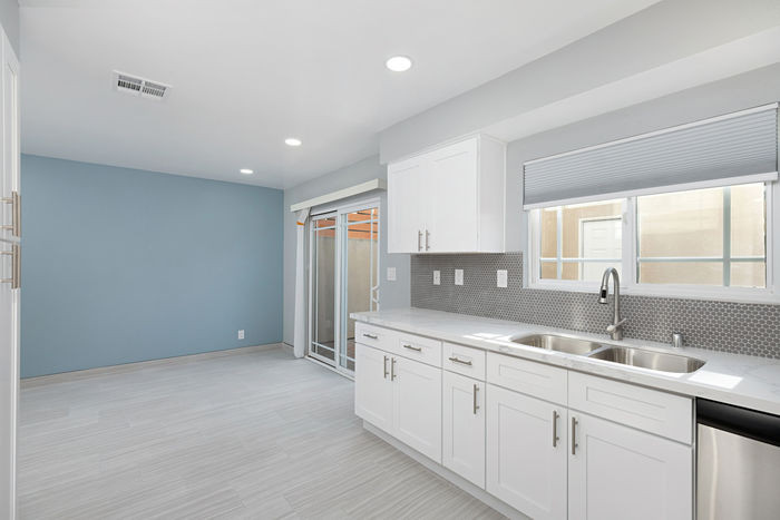 This project showcases modern kitchen renovations with white cabinets, stainless steel appliances, and stylish design elements. The images highlight the sleek and contemporary look achieved through the renovation.